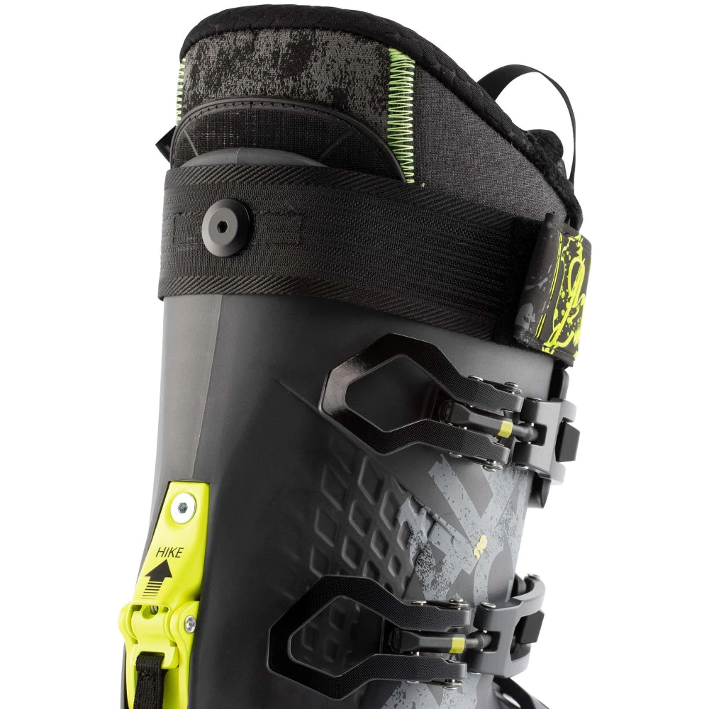 The lower boot shell is designed to offer a 50-degree range of motion in walk mode for efficient touring and maximum power for skiing when in ski mode
